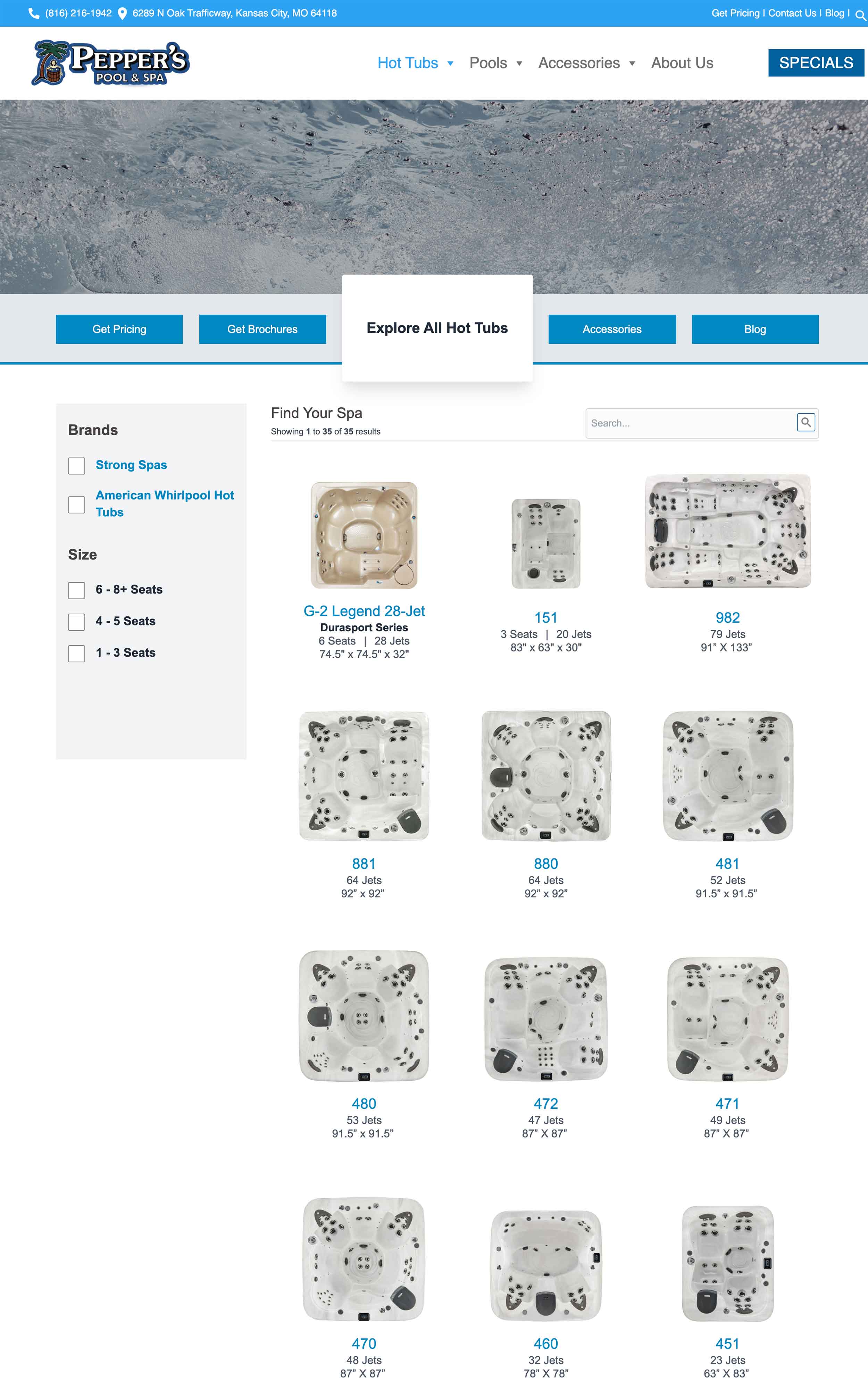 This is a hot tub dealer website in which we added hot tub brands and content for American Whirlpool, Vita Spas & Strong Spas. By using our syndication system, we are able to keep these products up-to-date and always current on this dealer site. We created a landing page with filtering functionality to showcase all the hot tubs this dealer sells.