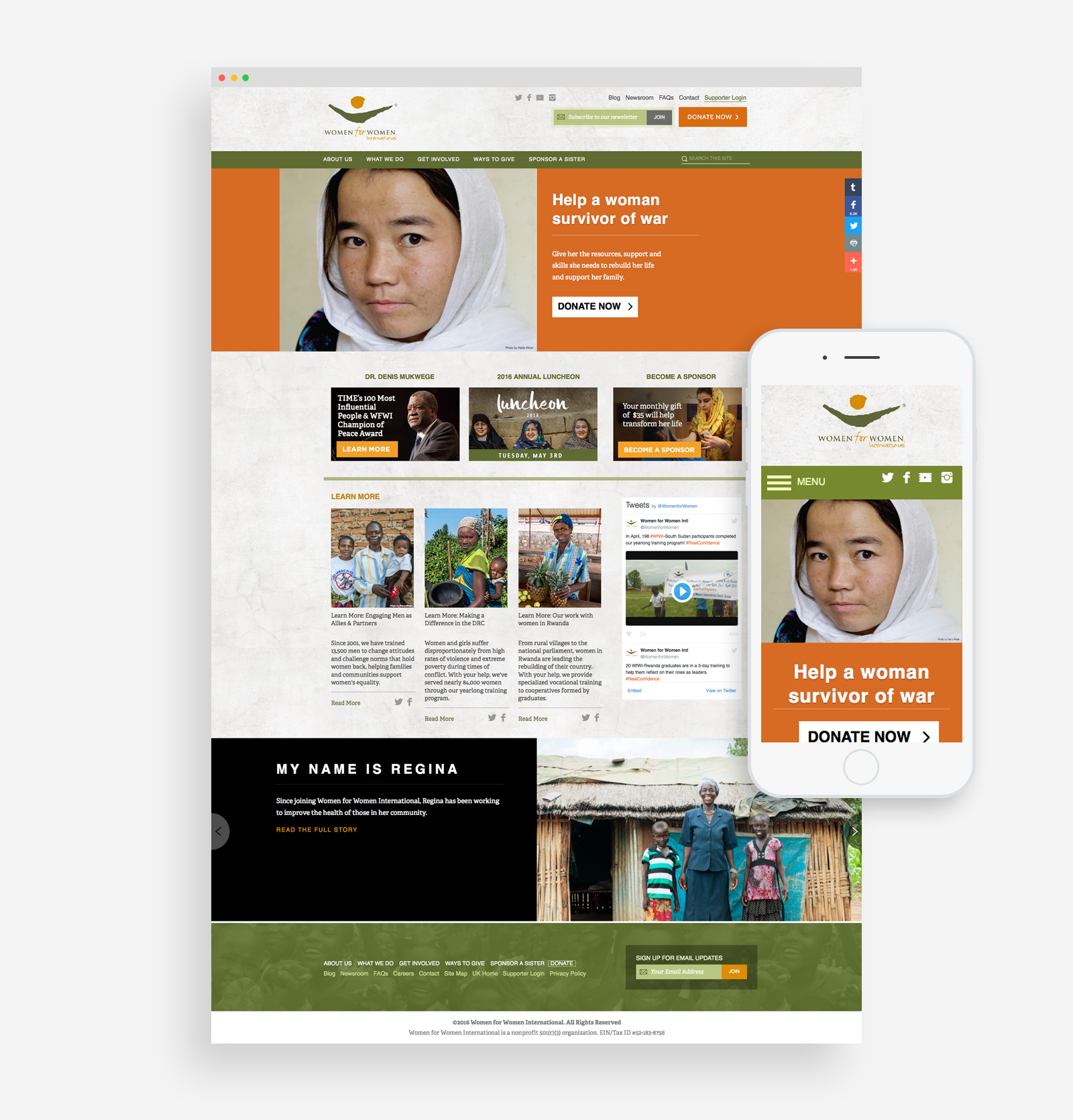 With the second retainer (AKA round two), DesignStudio shifted gears and focused on adding new templates and pages to the website. One of these pages is the “She Inspires Me” page, which is part of a year-long campaign that is one of Women for Women’s central projects right now. The landing page itself is incredibly specialized and incorporates a software service that aggregates social media content based on the campaign’s core hashtag “#SheInspiresMe.”